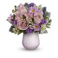 "Introducing our 'Fun Loving Bouquet' — a vision of serenity and softness that captures the heart with its pastel symphony. Lavender roses symbolize enchantment and love at first sight, while the playful pink Peruvian lilies represent friendship and devotion. The vivid purple of the matsumoto asters introduces a touch of royalty to the arrangement, and the dainty white chamomile daisies add a sprinkle of innocence. This bouquet is artfully cradled in silvery dusty miller foliage, a nod to the wisdom of lasting affection. Encased in a chic lilac vase with delicate ribbing detail, this arrangement is the perfect gift to express your tender emotions and brighten up any corner of the home or office.